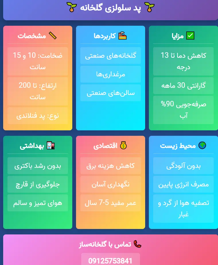 | کاربرد گسترده در صنایع مختلف | مورد استفاده در گلخانهها، دام و طیور، سالنها، کولرهای آبی و ساختمانسازی. |